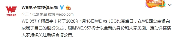 软件提交 专题合集 热门手游虽是意料之中毕竟很久没打比赛了,但官宣的这一刻还是让人伤心不已。1月6日,WE电子竞技俱乐部官宣:WE.957(柯昌宇)将于2020年1月18日WE vs JDG比赛当日,在WE西安主场完成属于自己的退役仪式,届时WE.957将会以全新的身份和大家见面。
