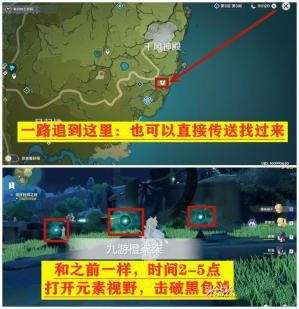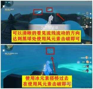 然后打开元素之眼可以看见有几道白色的流线,向一个地方飞去,终点有一个黑色的球球,我们到球球哪里,开启元素视野,使用风元素技能打破即可,共四个黑球,三个无需技巧,在海中的那一个使用冰属性技能搭桥在切换风属性击破即可。