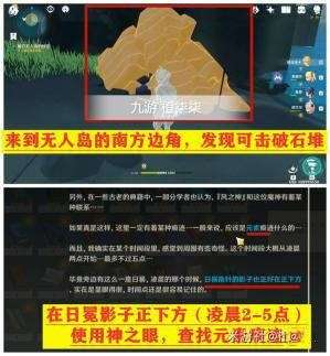 1、在无人岛中间可以看见一个日冕,对话日冕让我们在周围找找,我们先来到日冕右侧下方,可以看见带一个铁锹的一堆石头,打开元素视野也可以清楚的看见石头是可以打破的,直接打破石头,获得笔记~