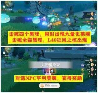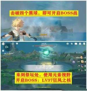 3、收集完全部的球,会出现一段旁白:“久远的故事已随风而来”,兄弟们要干架开BOSS了,把你们的血加加满,角色换成主C,来到日冕处看向中间祭坛,打开元素视野,开启BOSS战,出现LV37级狂风之核(兄弟们先别走,还有一段没讲完~别看见BOSS就感觉看完了~)