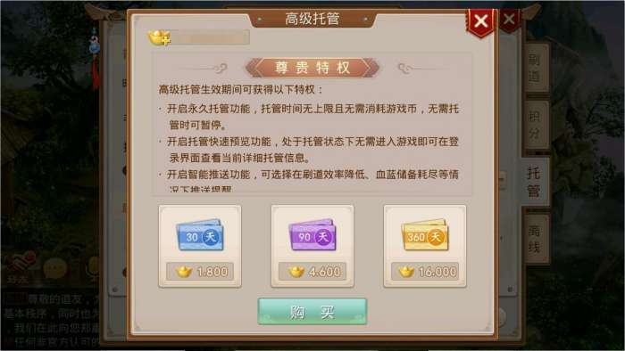 新增高级托管功能测试,花费金元宝开通后可享受以下特权: