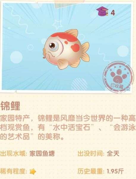 游戏中钓锦鲤的位置是很容易找到的,并且获得锦鲤的方式也是非常的简单,但是锦鲤获得到的概率却非常的小。游戏中锦鲤出现的地方就是玩家们所在的家园中,所以这样可以慢慢的去钓鱼了,也不用东跑西跑了,但是即使在家里也是很难钓上来的,锦鲤的钓上来的几率很小,所以这时候我们可以小技巧来钓鱼。