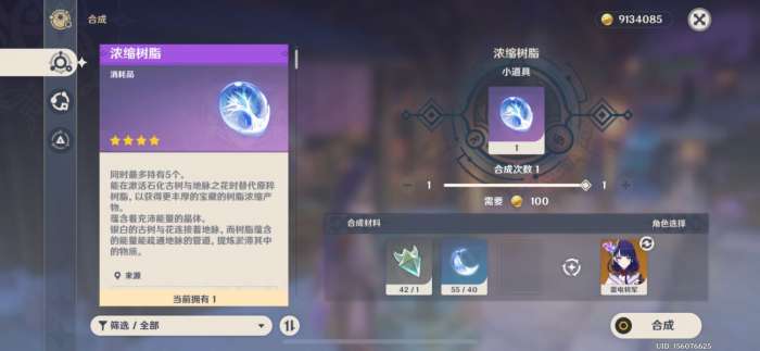 制作浓缩树脂需消耗晶核*1、树脂*40,可以在地脉花和圣遗物本使用后获得双倍奖励,这是晶核的核心用处!