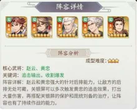 赵云和黄忠强大的针对后排能力,让敌方的后排无处可藏,关银屏可以多次触发黄忠的追击效果,打出大量伤害,再搭配关银屏的保护和庞统刘备的治疗,让阵容也有了持续作战的能力。