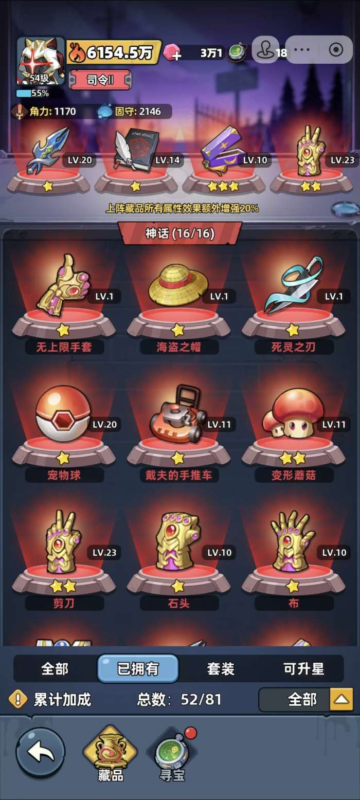然后就是藏品基本上是可以携带10件-16件的样子,如果玩家们的神话藏品数量实在是太少的话,至少在中间的格子需要携带一个神话藏品,后续其他的格子可以选择蓝色或者紫色品质的,同时中间的藏品方面要尽量选择核心藏品,就是增加角色技能伤害的,最外围一圈的藏品可以选择防御属性的,从而提高角色的容错率。