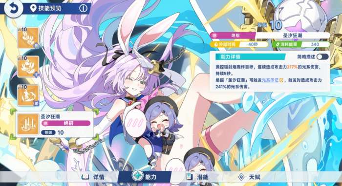 当人们使用以希娅为主控的光系队在星塔里进行闯关时,可为她搭配雪兔流和夜兔流这两种不同倾向性的潜能方案,雪兔流主要依靠技能中的雪兔无人机来进行输出,而夜兔流则更侧重于强化夜兔无人机的伤害。其中,雪兔流擅长与单体目标的敌人作战,核心潜能效果为霁雪化刃、幻步临光和雪域压制,夜兔流则刚好相反,该流派在敌人较多时更好发挥,核心潜能效果为月华倾泄、星舞追跃和月能爆裂,有条件的玩家可两种流派都保留一个记录。