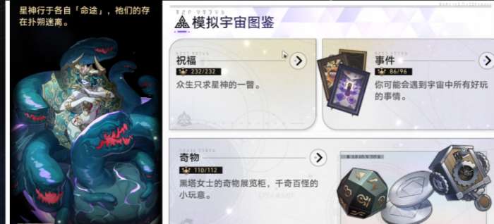 在模拟宇宙本体中,能够获得的增益有两种,一种是祝福,另一种则是奇物。战斗和事件则是获取这两种增益的方式,当然事件不一定都是好事件,也可能遇到失去祝福或奇物的事件。