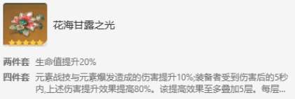 2、花海甘露之光四件套:在一定程度上提升角色的输出伤害,妮露受伤也可短期提高妮露的伤害,可以通过熔铁的孤塞I-IV获得这一套。