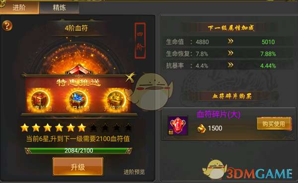 血符系统是加生命值,回血,和抗暴击的,血符的产出在绑元商城,boos地图,副本都能得到,阶为越高加的属性就越高,每天可以多挂机打打boos可以得到大量的血符碎片用来升级血符。