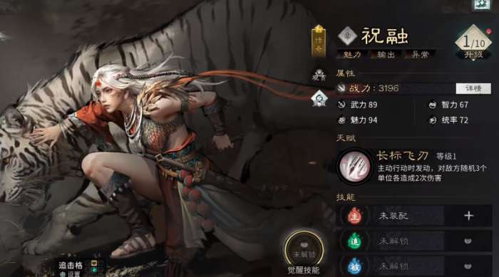 祝融是游戏里的的一个角色,作为一个传奇角色,角色主打的是输出,所以本身的战斗能力是比较强的,在游戏里角色最基础的战力可以达到3000多,随着等级的提升,这些战斗力也会继续升级,除了较强的战斗力之外,角色的魅力值也是比较高的,要在对战的时候,利用角色的这几项能力,在最初级的时候,角色会拥有长标飞刃的天赋,一旦角色主动发起进攻,那会直接对对方的三个角色连续造成两次伤害。