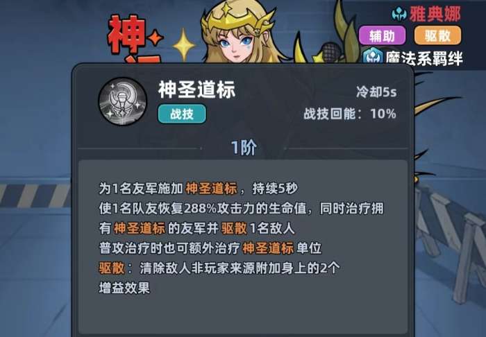 雅典娜可通过自身职业特性获得10%的减伤效果,并且自身具有格挡率提高10%的幸存者特性,所以即便为辅助,雅典娜自身的生存能力也并不低。当她释放战技时,会随机挑选一名友军对其施加持续5秒的神圣道标,并且会在自己为另一名队友治疗时,让拥有神圣道标效果的友军同样能享受到本次的治疗,同时还会随机驱散一名敌人身上的两种增益。随着雅典娜的星级提升,她战技的治疗倍率也会大幅提高。