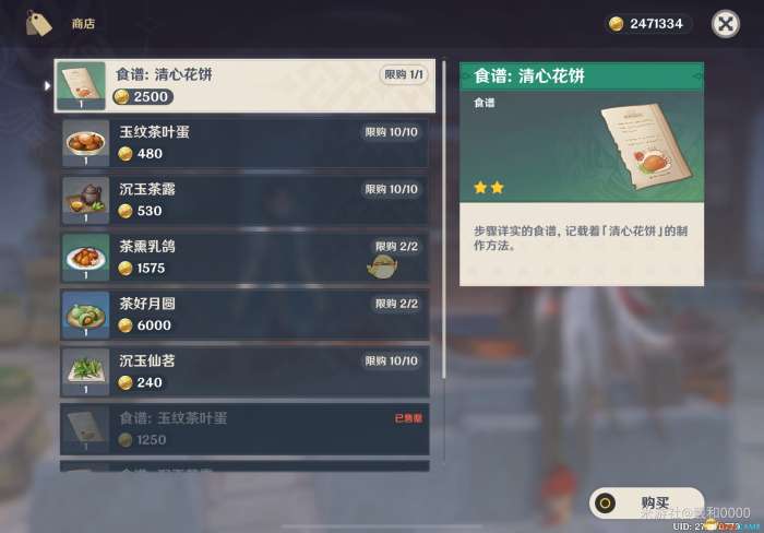 3接着在小吃摊的商店内,选择清心花饼,花费摩拉币购买即可获得食谱