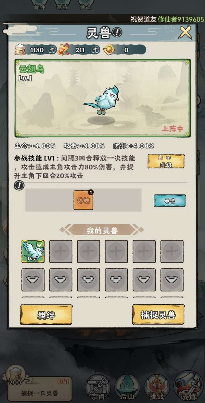 前建议抓捕灵兽:铁角牛*4(金属性),土家蜥*4(土属性),云翅鸟*4(木属性),御兽符充足的情况下,可以抓蓝宠或者紫宠,水系宠物不建议碰,抓捕的灵兽不要着急吞噬,这是为了第三天的神兽遗迹活动打基础,下图有参考。