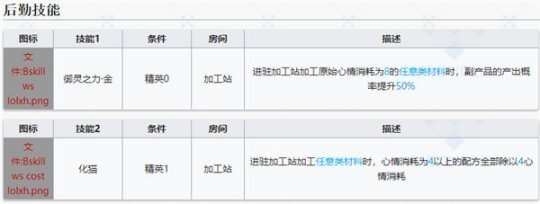当使用消耗原始心情值为8的任意材料加工时,进驻加工站的副产品产出概率将会提高50%。