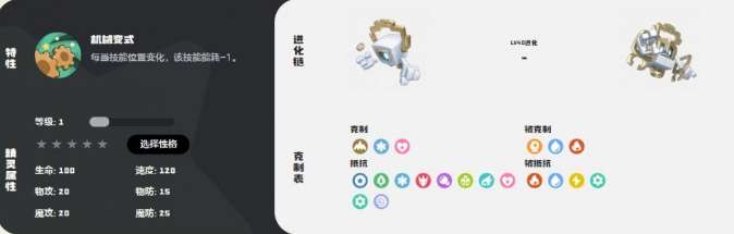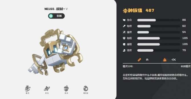 权杖种族数值是487整体来看真的并不算是很突出,但是属性的分配还是很有针对性的。86点生命值,搭配105点的魔法防御,还有物理性防御,就会成为机械系里面的扛伤小能手。在面对魔法攻击还有物理性攻击时,都可以从容的应对。75点速度可谓是中规中矩,还有62点物理性攻击以及54点魔法攻击,更加偏向于物理性输出路线。每一次技能出现位置变化时,对应的技能还会减少一点能耗。这一个特性就会直接盘活技能体系,搭配其余的招数,就可以降低能耗的压力。