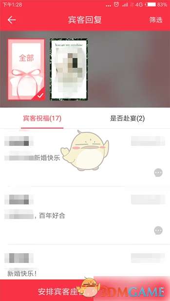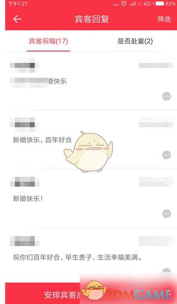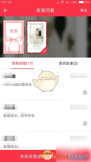 4、接下来就会打开宾客回复界面了,这里有宾客祝福和是否赴宴两个回复。