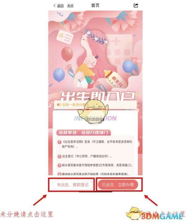 4、如孕妇未分娩,请点击“未出生,提前登记”;如产妇已分娩,请点击“已出生,立即办理”