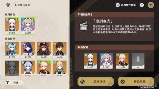 「特技光效」:凛冽寒光,施放后12秒,以当前角色为中心,每4秒释放水元素冲击,造成水元素伤害;队伍里冰元素伤害提升60%。