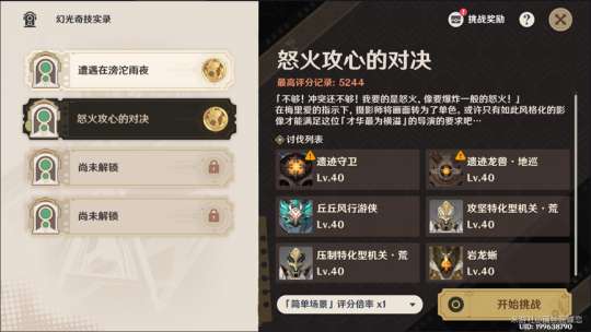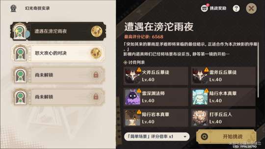 阵容搭配:两个试用角色加上一个聚怪的角色即可,如果是使用战技聚怪的角色对充能要求不高,使用大招聚怪的角色就要保证大招充能能跟上,因为是40级的怪物生存没有压力可以带上自己的充能武器,圣遗物可以选择充能词条多的,这里如果带的是万叶的话可以选择使用祭礼剑体验更舒服。