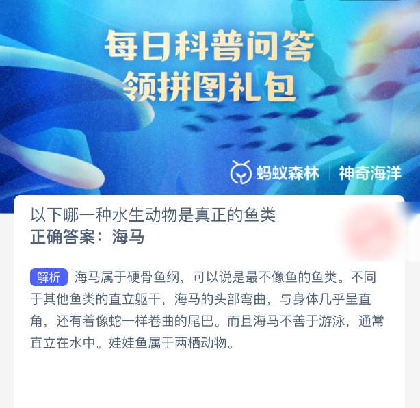 软件提交 专题合集 热门手游以下哪一种水生动物是真正的鱼类?【神奇海洋】10月21日新题目已开答!正确答案现已公布,点击领取拼图,一起为修复海洋生态贡献力量!今日正确答案是:【海马】,海马属于硬骨鱼纲,可以说是最不像鱼的鱼类。娃娃鱼属于两栖动物。