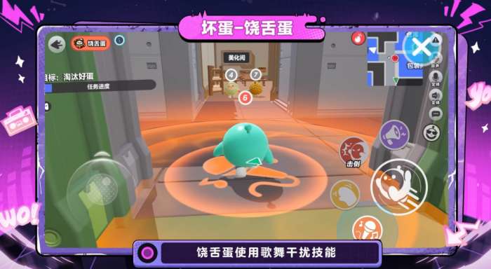 然后是3月20日新上线的三个职业。第一个是坏蛋阵营的「饶舌蛋」。这个职业有一个歌舞干扰技能,释放之后会向周围的蛋仔展示饶舌才艺,同时让附近的蛋仔视觉和听觉都受到干扰。这个技能在破坏好蛋的沟通和判断上有一定效果,用在关键时刻可以制造混乱,给坏蛋阵营争取操作空间。