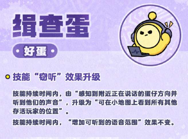 缉查蛋的「窃听」技能也做了升级。以前这个技能只能感知到附近正在说话的蛋仔方向,顺带听到声音。升级之后,技能持续时间内可以直接在小地图上看到所有存活玩家的位置。原本增加语音范围的效果也保留下来了,两个效果叠在一起,信息获取能力一下子强了很多。对于好蛋来说,缉查蛋在侦查方面的作用更突出了,合理利用这个技能,能帮整个好蛋阵营掌握更全面的局面。