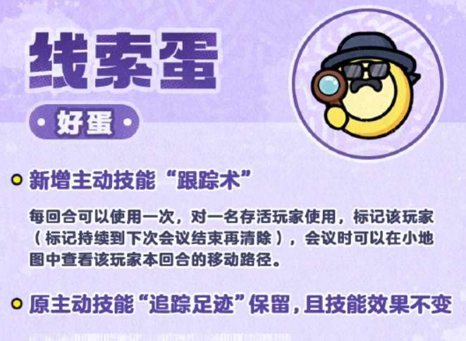 先说说老职业的技能变化。线索蛋这次新增了一个主动技能,叫「跟踪术」。每回合可以用一次,对一名存活玩家使用之后,会给对方打上标记。标记会一直持续到下次会议结束才消除。会议阶段的时候,线索蛋可以在小地图上看到被标记玩家本回合的移动路径。这个技能的作用很直接——帮助好蛋阵营在会议讨论时提供更具体的行动证据,减少大家靠猜的情况。用得好的话,定位嫌疑人的速度会快不少。