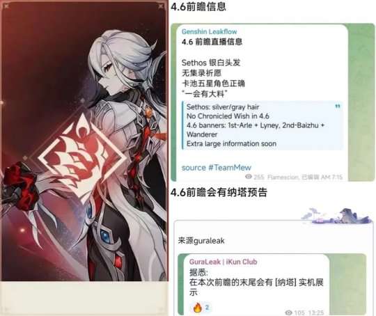 而在4.6的前瞻中,舅舅们也提到会有几个重要的点,首先就是之前提到的新四星草弓男角色赛托斯了,目前看来赛托斯是银白头发,大概率会出现在4.6的前瞻直播中,发色的话应该算是万叶同款了,之前提到的第二期混池也不会在4.6版本登场,所以说想要抽取老角色的小伙伴们可能要再等上一段时间了。
