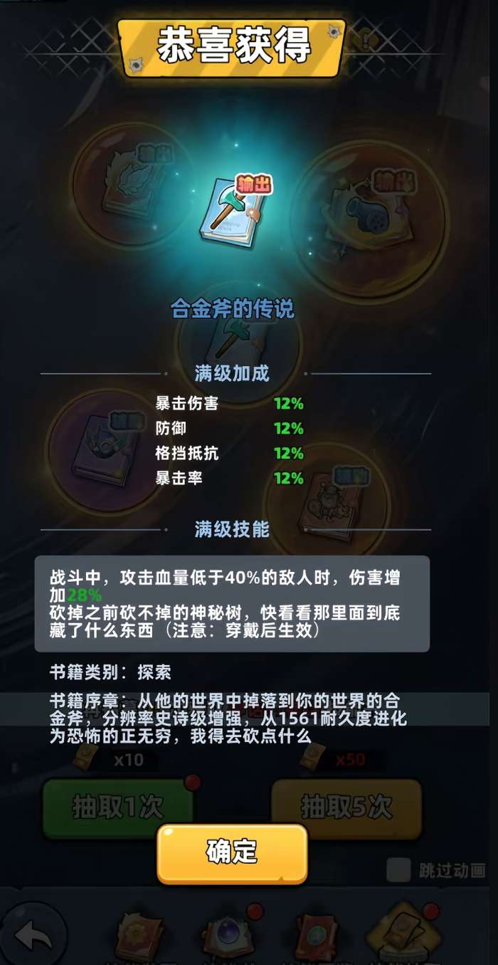 装备合金斧的传说这个技能以后,我们在推图过程中遇到挡路的树木时就可以直接利用该技能砍树,当树木被砍倒之后就会消失,然后开辟一条通往隐藏区域的道路,让大家继续探索和搜寻。如果大家的推图进度已经到了“寒冰之地”也没关系,我们可以随时返回医院副本进行获取。另外除了副本,大家还可以通过抽奖的方式获得,但是能不能抽到就凭大家的运气了。