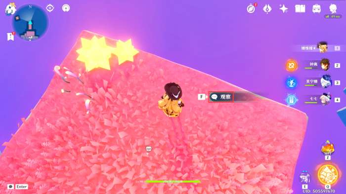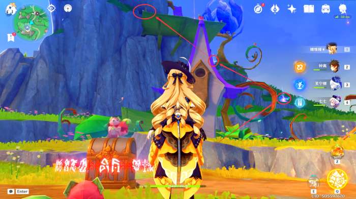 过来后,我们T一下小飞鼠,需要在90秒内指挥她穿过所有花环(挑战一共有三轮,此处可以利用「跳跃光团」快速前往山顶,这里过程就不多叙述了)