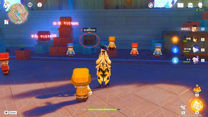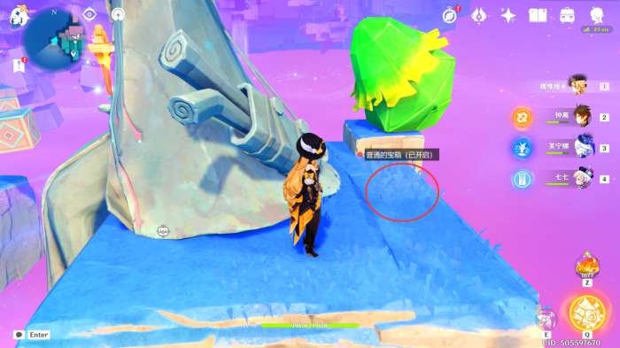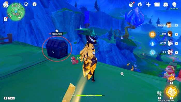 这里我们往宝箱的正东方看去,可以看到有五个丘丘人,我们过去直接将其全部解决掉,可以获得一个普通的宝箱