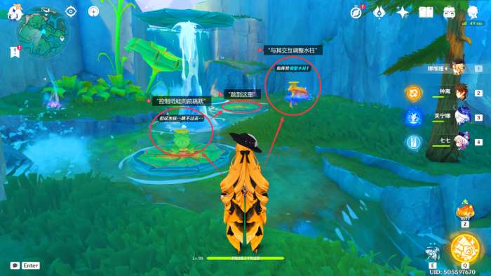 在“荷叶纸蛙”跳到第二个荷叶上后,我们先与“水柱纸蛙”交互,让其调整水柱,接着按T指挥“荷叶纸蛙”跳到第三个荷叶上,之后再与“水柱纸蛙”交互,让其调整水柱,使第三个荷叶上的“荷叶纸蛙”到达瀑布上方