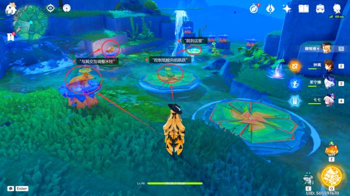 在“荷叶纸蛙”跳到第二个荷叶上后,我们先与近处的“水柱纸蛙”交互,让其调整水柱,再与远处的“水柱纸蛙”交互,让其调整水柱,接着按T指挥“荷叶纸蛙”连续跳到第四个荷叶上即可