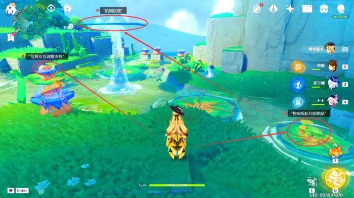 在此处可以看到一个「纸蛙跳远」解密,我们先与“水柱纸蛙”交互,让其调整水柱,接着按T指挥“荷叶纸蛙”连续跳到第二个荷叶上