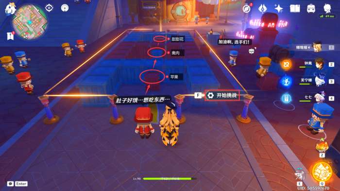 选择“开始挑战”后,我们依次在前方的箱子上放置苹果、禽肉、甜甜花即可