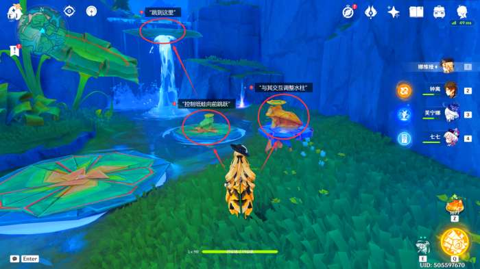 来到瀑布上方后,我们先与远处的“水柱纸蛙”交互,让其调整水柱,接着按T指挥“荷叶纸蛙”连续跳到第二个荷叶上