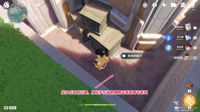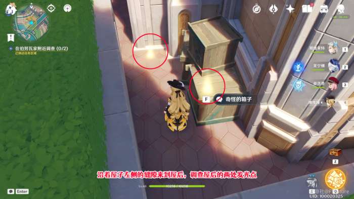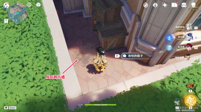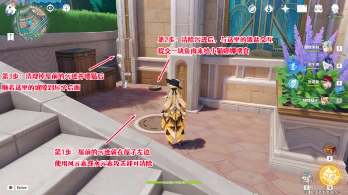 第一处污迹就在屋子左侧(面向屋子时),可以用水元素或风元素技能攻击来清理,之后与饭盆交互,提交一块鱼肉即可喂食。完成后,我们沿着屋子旁边的缝隙前往屋子后面。