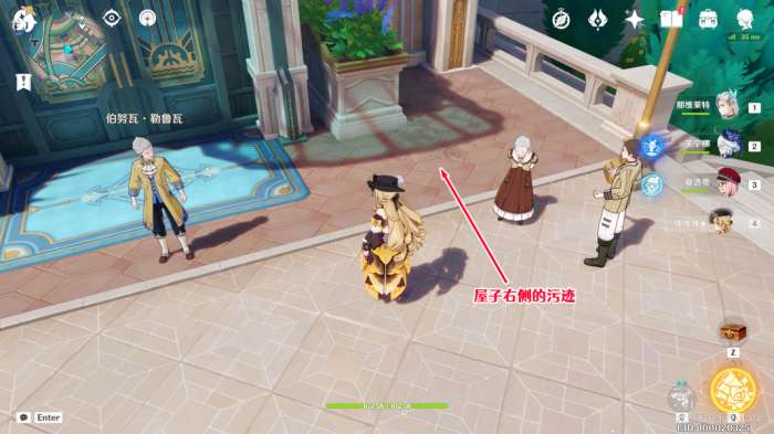 对话结束后,我们使用风元素或水元素攻击,清理小屋门口左右,以及小屋后面角落里的污迹即可。(白天污迹看不清楚的话,可以使用元素视野观察)