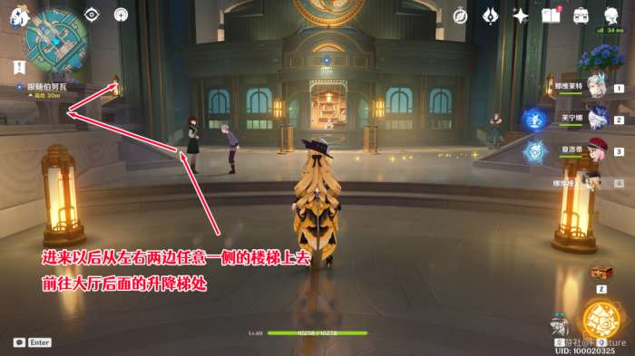 进去以后从左右两侧任意一边的楼梯上去,前往大厅后面的升降梯处。