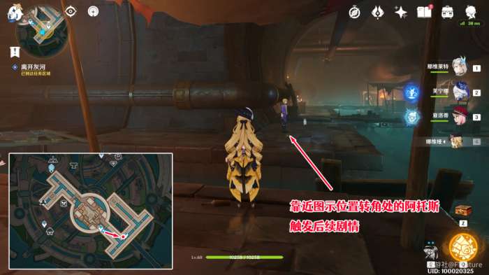 了解情况后,接下来我们到灰河图示位置的转角处,触发与阿托斯的对话。剧情结束后即可完成世界任务「勒鲁瓦·午时已至」。