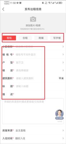3、进入后,选择整租、合租、出租商铺,还是写字楼后,在将出租信息完善后点击下一步