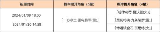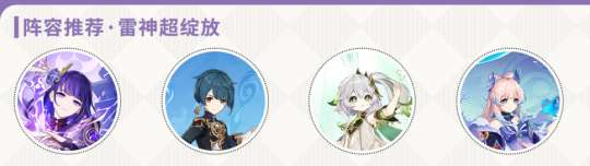 当期雷神卡池是对萌新最优好的卡池之一,五星角色【雷电将军】+四星角色【夏沃蕾】【九条裟罗】【班尼特】,一个主C+三个辅助,四个角色直接即可成队。此外,在通关深境螺旋第三层后,萌新们还会获赠四星角色【香菱】,可以组成更多强力配队。