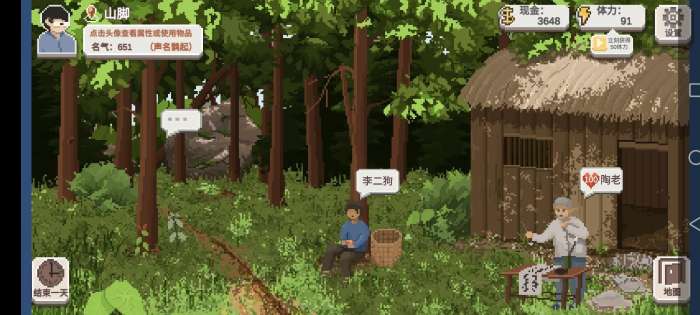 李二狗(聊天概率获得上山buff增加上山寻找好东西的概率)陶老(聊天获得10教学经验概率会跟陶老进屋喝茶获得20体力)陶老是好感度升段名声要求最高的,到100需要450的名声。这里还会出现随机的草莓(加10体力),蘑菇,竹笋,上山寻找会获得草莓,辣椒,蘑菇,木耳,野葡萄(加20体力),蜂蜜(加30体力)还有两个值钱的我忘了