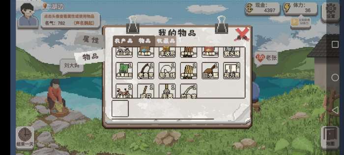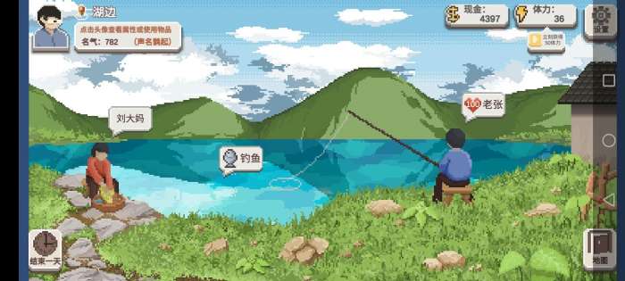 刘大妈(聊天概率获得一个柿子)老张(请教获得钓鱼经验或概率获得一条锦鲤)老张是三个人物中名声需要最低的,好感度升满最后会获得一个老张的鱼竿我称之为第二神器,当你获得了这个鱼竿就去市场买高级鱼饵,然后来这里钓鱼(好鱼一开始的时候难钓慢慢来就习惯了)我是靠钓鱼发家致富的当然前期不需要买鱼饵,在印刷厂(必刷一个),湖边,市场,田园,操场会概率刷蚯蚓(5体力)