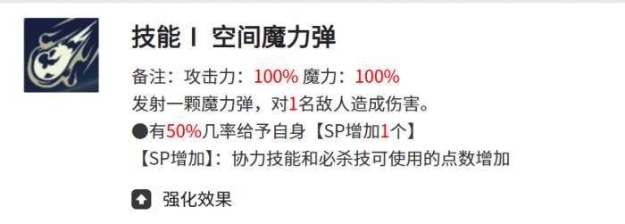 空间魔力弹和伯德家族的矜持是兰吉尔斯的主动技能,空间莫丹谈是一个攻击力和魔力均为100%的技能,这个技能可以对敌方1名敌人发送1颗带有着高额伤害的魔力弹,魔力弹命中目标的时候还有50%的可能性会给自身附加上1个sp,sp指的是协力技能和必杀技,sp增加后兰吉尔斯的协力技能和必杀技的可用点数都会出现增加。