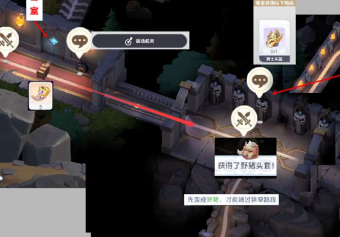 获得野猪头套后,可以看到墙上有个聊天气泡,点击后提示需要”骑士头盔“才能解锁。暂且关闭,等找到头盔后再回来。此时右侧、下方各有一条路径,右侧无法通行,所以我们向下走。这里需要先变成野猪才能通过。(见下图)