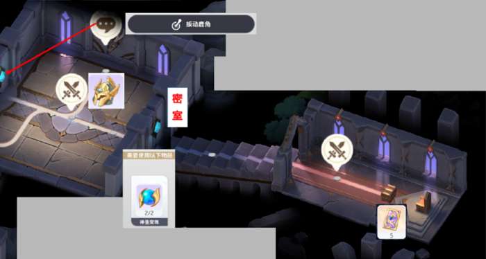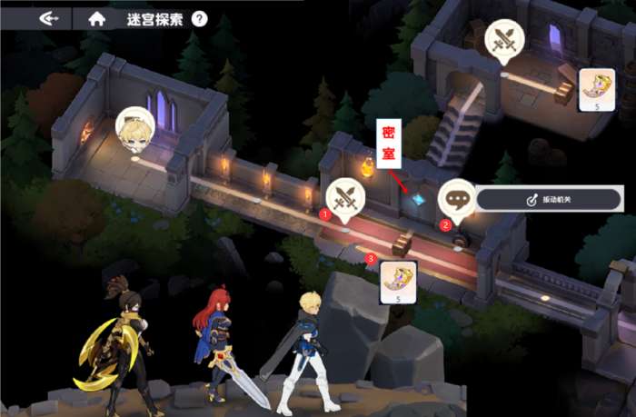如上图所示,进入迷宫向右走,完成第一场战斗后可领取宝箱(1/4)。然后点击旁边的对话气泡“扳动机关”,打开密室暗门。进入后完成另一场战斗后,领取宝箱(2/4)。