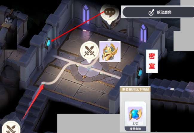 向上走进入到另一个房间,完成中间的战斗后会获得解密道具”骑士头盔“。点击墙上的聊天气泡”扳动鹿角“,会将左侧的暗门打开。点击右侧暗门下的路点,会提示需要两个蓝色道具,才能开门(而我们目前只有一个)。暂且关闭,继续寻找第二个蓝色道具。