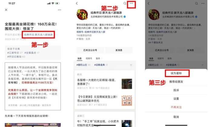 最近微信改版了,如果不设置星标⭐️,就很难看到八妹了。“星标”操作非常简单,只有3步:1、点击标题下面的蓝字【经典怀旧 新天龙八部端游】;2、点击右上角三个点;3、点击设为星标就可以啦!