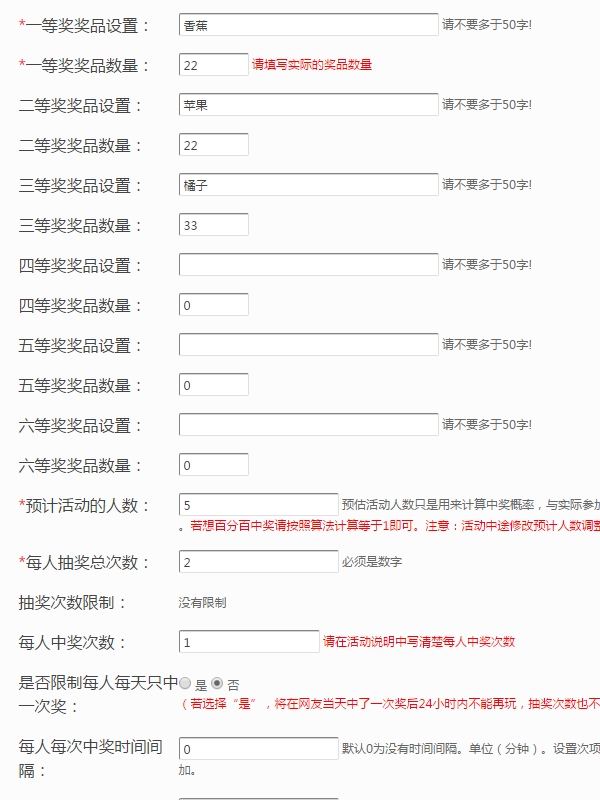 最后就是奖品的添加,然后就可以保存测试了,还可以随时删除重新添加,这些都是不限制次数的,很方便我们没有怎么接触过第三方的抽奖活动的小伙伴;